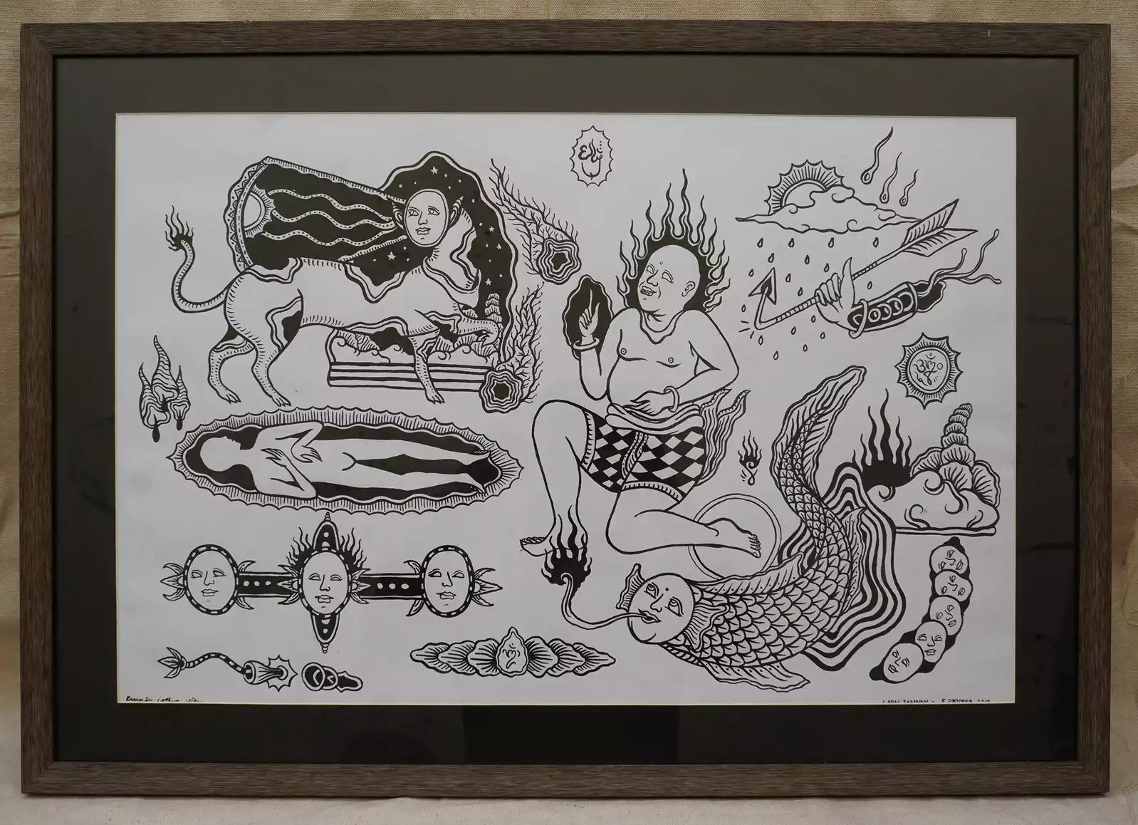 Kuncir Sathya Viku graduated from Denpasar Institute of Art in 2013 with a degree in Visual Communication Design, and worked as a Graphic Designer for several years before he decided to make a path of his own. Infusing his training as a rerajahan (visual mantra) illustrator for his father – a balian (Balinese shaman), combined with his artistic experiences working with murals on the streets, Kuncir explores lines and forms that are rooted in Balinese visual language.