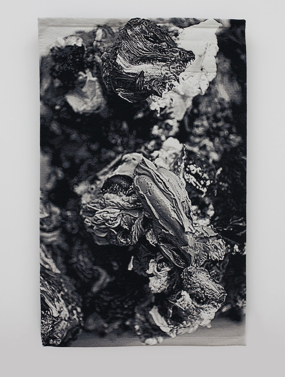 Images of detritus, carcasses, and decay are embedded into the handiwork of design, craft, and fashion, while merging the disparate qualities of the maligned and marginalised with the celebrated and desired. From her ornately shaped canvases to sculptures shrouded by fabric, their arrival as fragments, shadows, or memories, according to Eustaquio, underline their aspirations, their vanity, this ‘desire to be desired.’ Her wrought objects — ranging from furniture, textile, brass, and glasswork in manufactured environments — likewise demonstrate these contrasting sensibilities and provide commentary on the mutability of perception, as well as on the constructs of desirability and how it influences life and culture.
