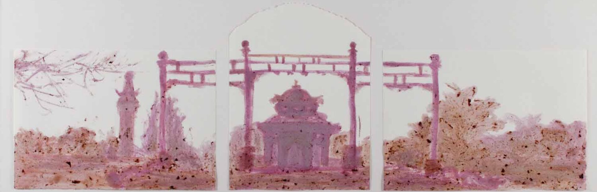 The ‘Mausoleum’ drawing series are based on my uncle’s photographs from the 1950s, taken in front of the tombs of the kings (Thieu Tri, Dong Khanh, Khai Dinh) in Hue, a citadel which housed the old capital of Vietnam. Those drawings are a sort of third space, emerging from twists and distortions between my memory and my uncle’s memory. By using decaying plant-based pigments, I think the materials reveal the mausoleum’s deterioration in reality.