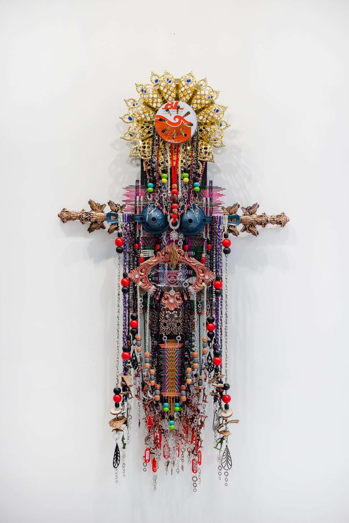 Anne Samat, 'Mother (weave through eternity) #1', 2022, rattan sticks, kitchen and garden utensils, beads ceramic, metal and plastic ornaments, 167.6 x 96.5 x 12.7 cm. Image from Marc Straus Gallery