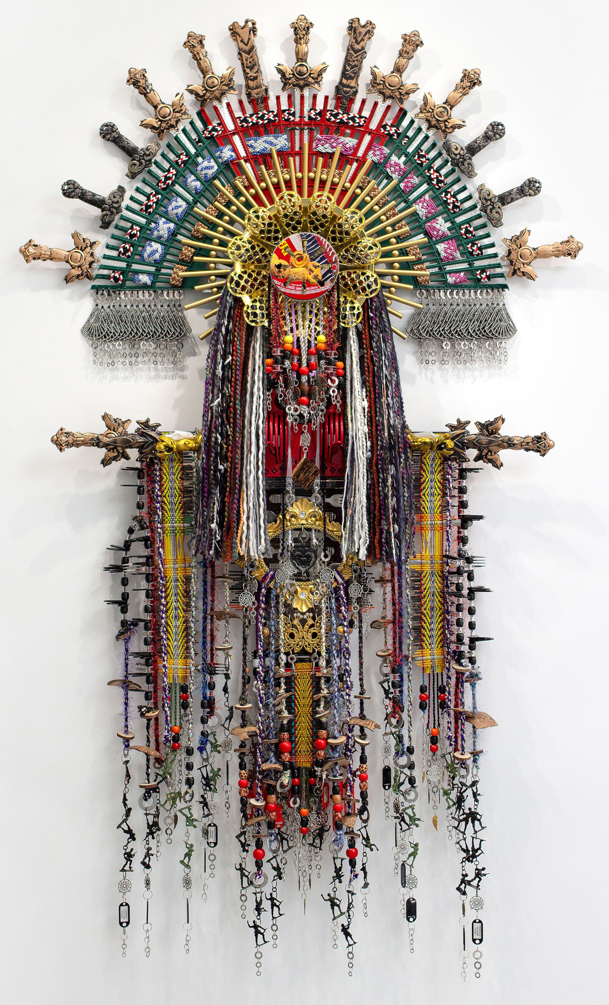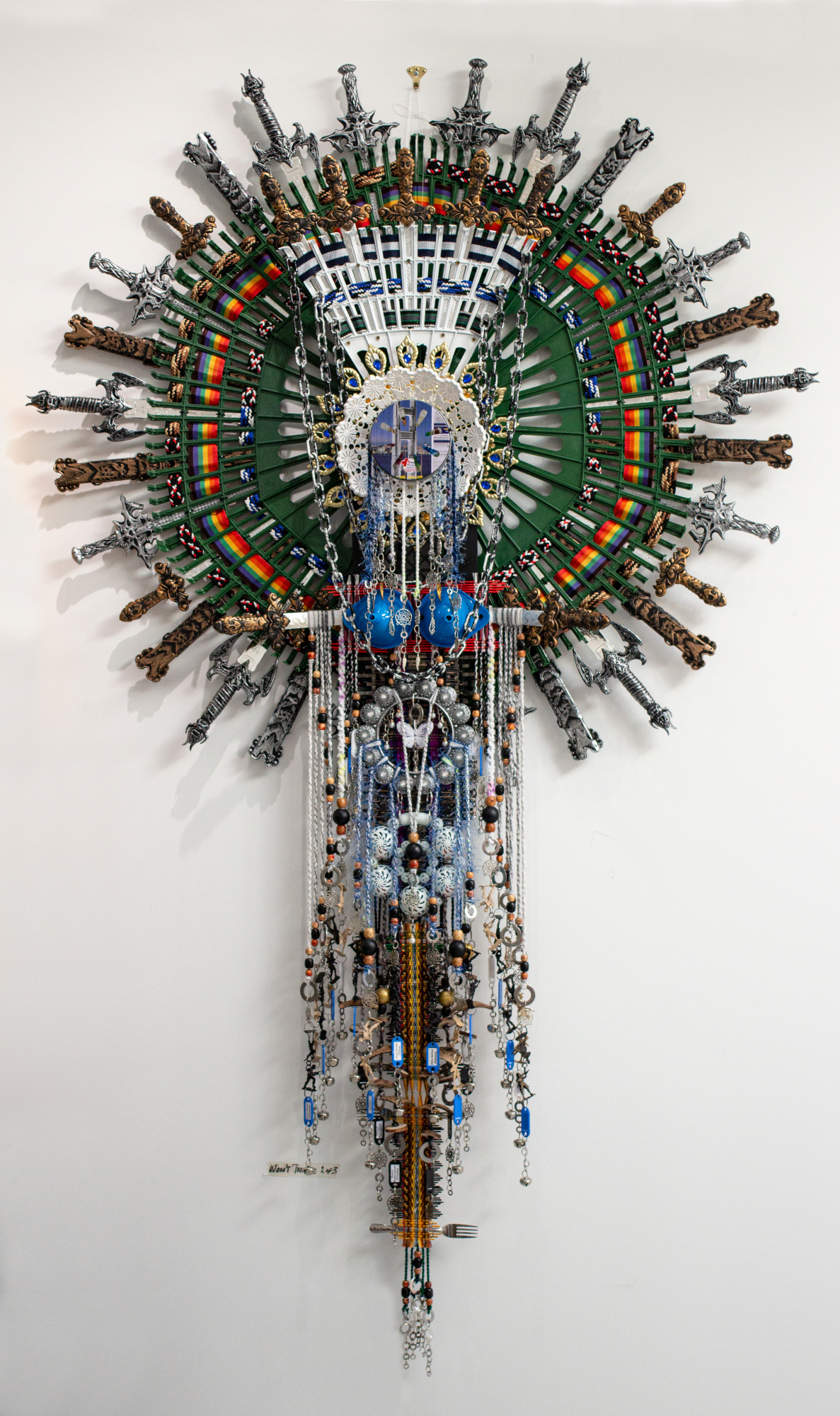 Anne Samat, 'Sewing the Seeds of Love, Courage and Hope #3', 2021, rattan sticks, kitchen and garden utensils, beads ceramic, metal and plastic ornaments, 226 x 132 x 17.8 cm. Image from Marc Straus Gallery