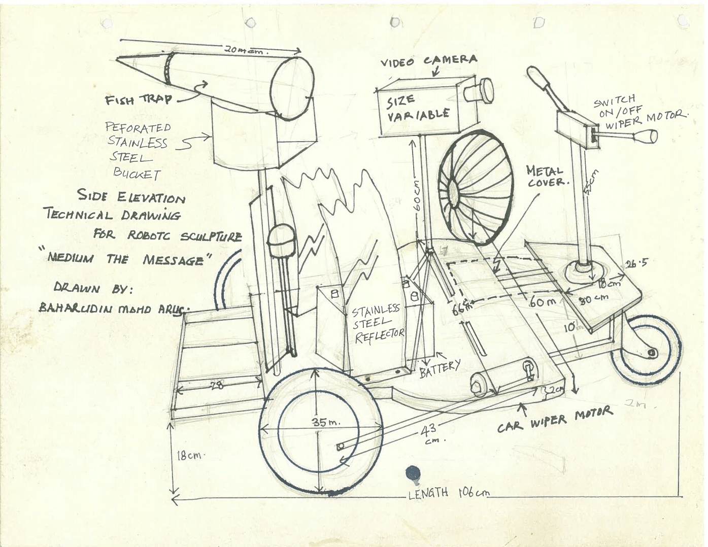 Baharudin Mohd Arus, technical drawing of 'The Medium is the Message (After Marshall McLuhan)', 2022, illustrating a machine made with a lawnmower, a video camera, and a fish trap. Image from National Gallery Singapore
