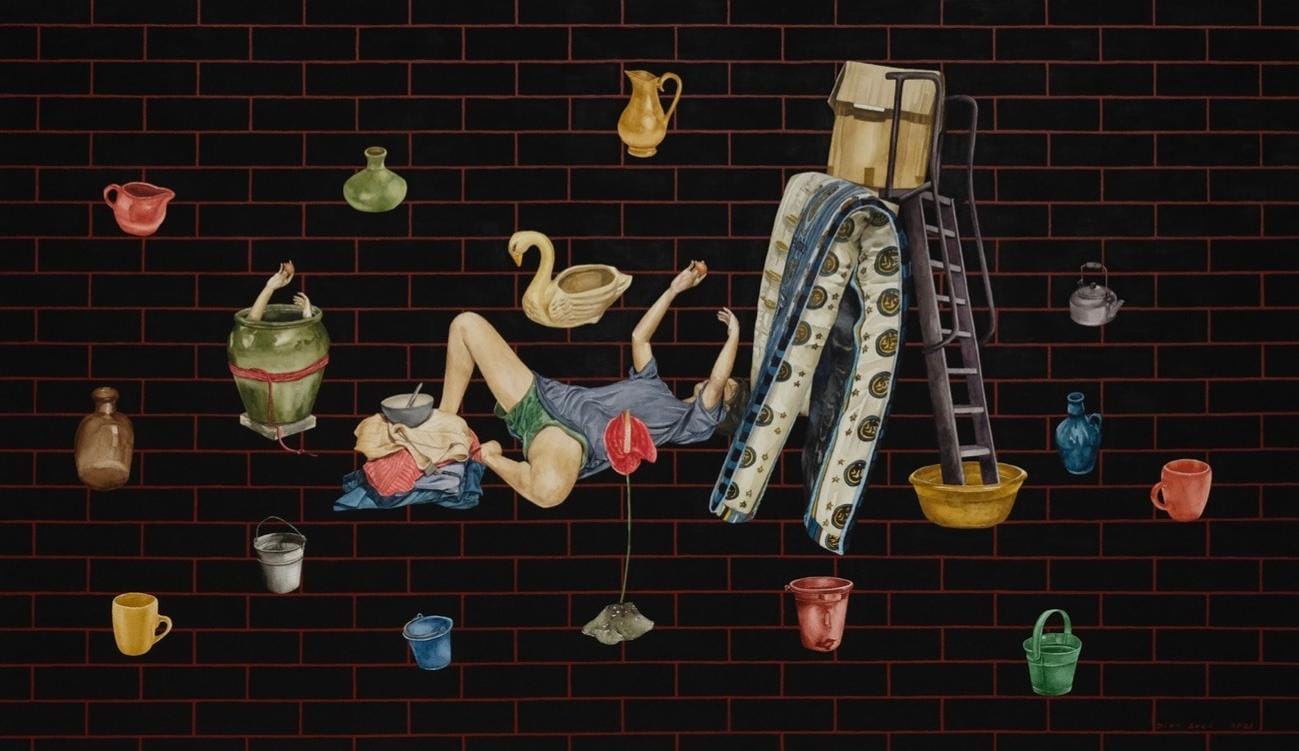 Dian Suci Rahmawati, ‘Dalam Penjara yang Tak Sama’, 2021, watercolour, gouache, and acrylic on paper, 114 x 65 cm. Image from IndoArtNow