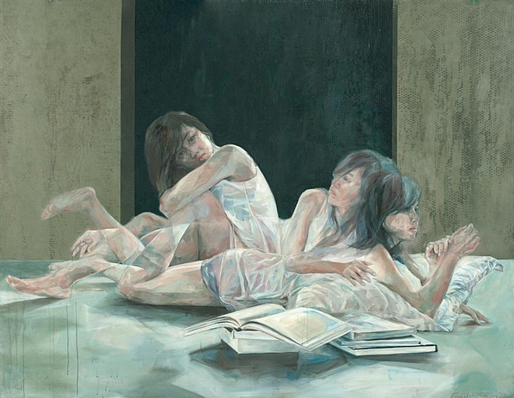 She is regarded as one of the most prolific young artists in Malaysia, known for her body of large-scale figurative works which are autobiographical by narrative and muted realism in style. Every image tells a story – melancholic scenes of a girl, her face partially hidden from the viewer (sometimes with a sandy rabbit), or characters falling into the unknown – there’s a sense of despair about it all.