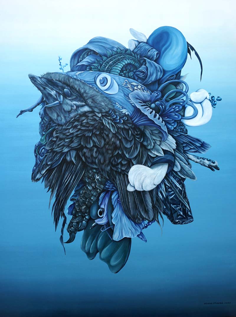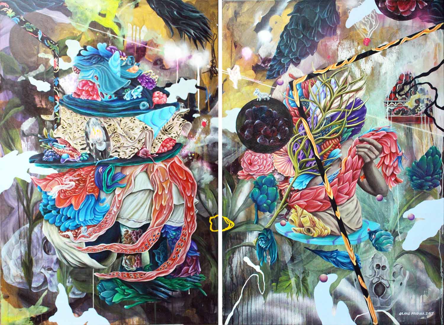 Working mostly with two-dimensional surfaces, particularly in painting and etching, Gilang’s work process attempts to understand the interaction between creatures and the social response of people, with imagined objects as alternative forms and metaphors. These objects are a combination and deformation of many overlapping images; the anatomy of the human body, plants, animals, and the occasional pop culture icons.