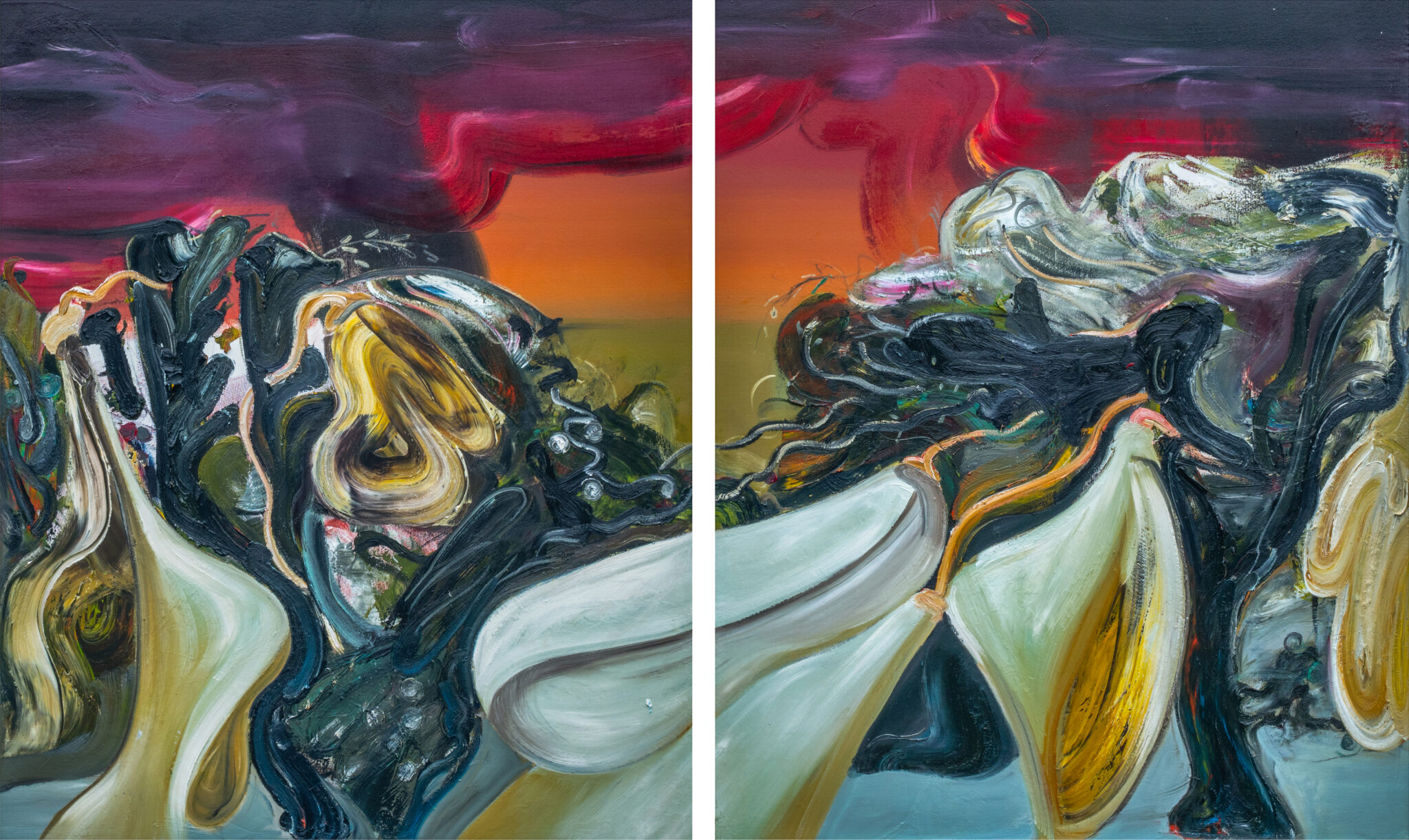 Herru Yoga, ‘The Sunset Between Olives and Date Palms’, 2021, oil on canvas, 151 x 125 cm (2 panels). Image from Gajah Gallery