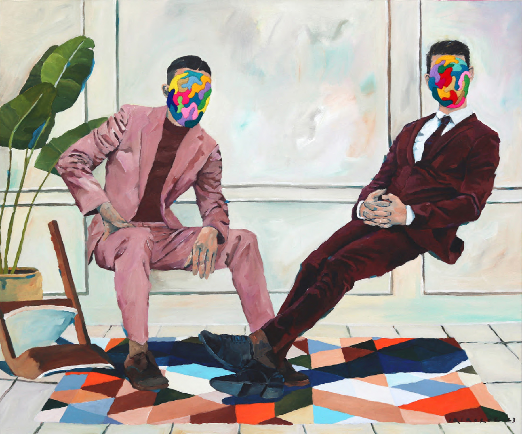 Iqi Qoror, ‘Perfect Chairs’, 2023, acrylic, wool on canvas, 100.3 x 119.4 cm. Image from Artsy