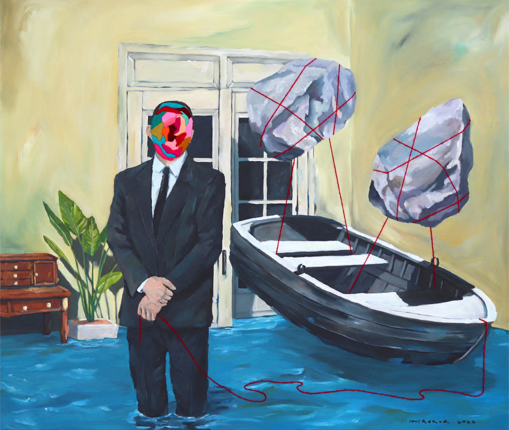 Iqi Qoror, ‘The Floating Boat’, 2022, mixed media, acrylic, wool on canvas, 109.2 x 29.5 cm. Image from Artsy