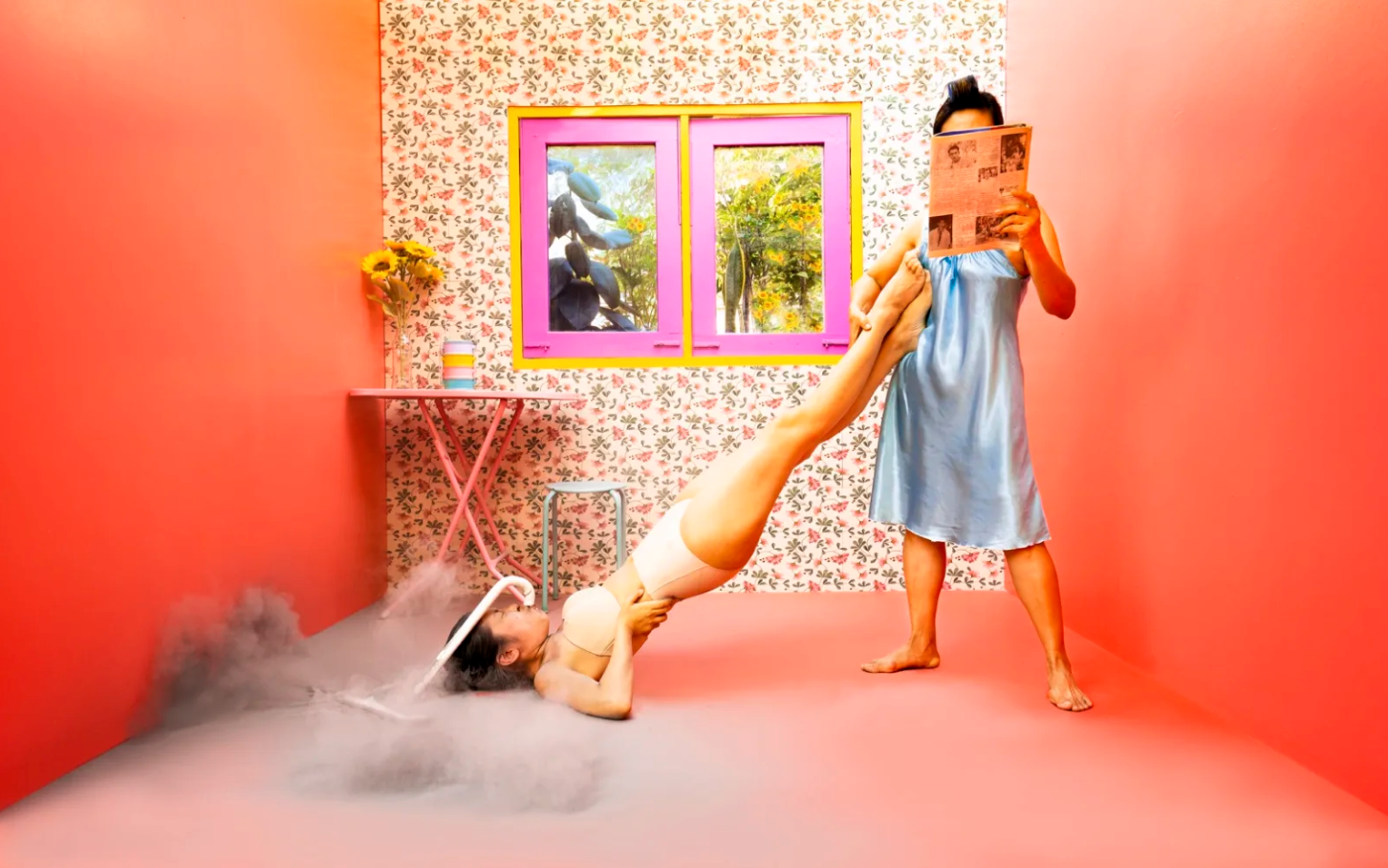 Vatanajyankur undertakes various repetitive and strenuous tasks, turning herself into mechanical tools and domestic objects as she pushes her body to its limits as a testament to human capabilities and female resilience. Drawing from a globalized and digitally networked visual language of consumption and instant gratification, her videos bear semblance to bold and colourful commercial advertisements, only breaking away from their similarities within her constantly recurring moments of physical and emotional discomfort; the result is a body of work that is as strikingly compelling as it is uncomfortable to witness.