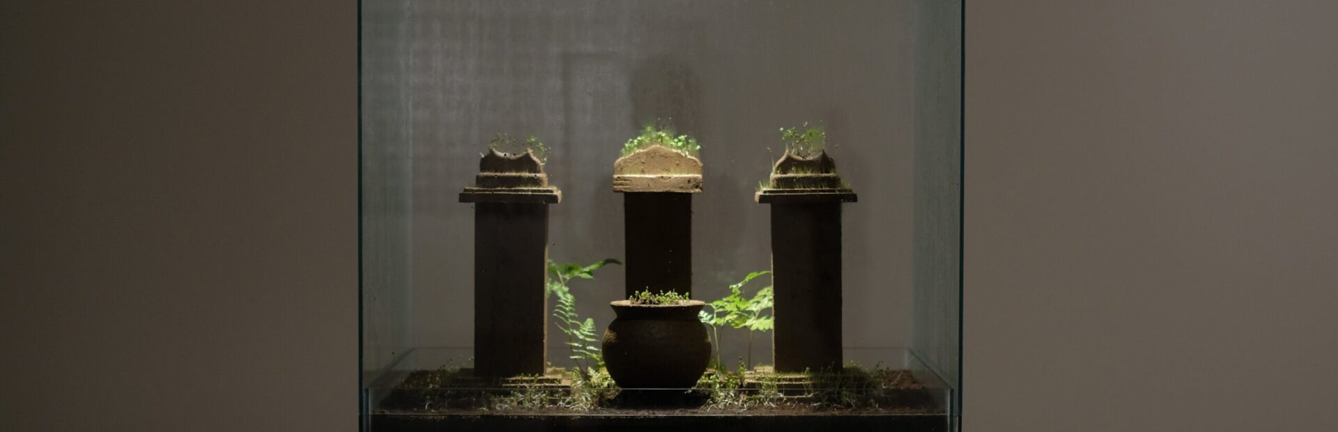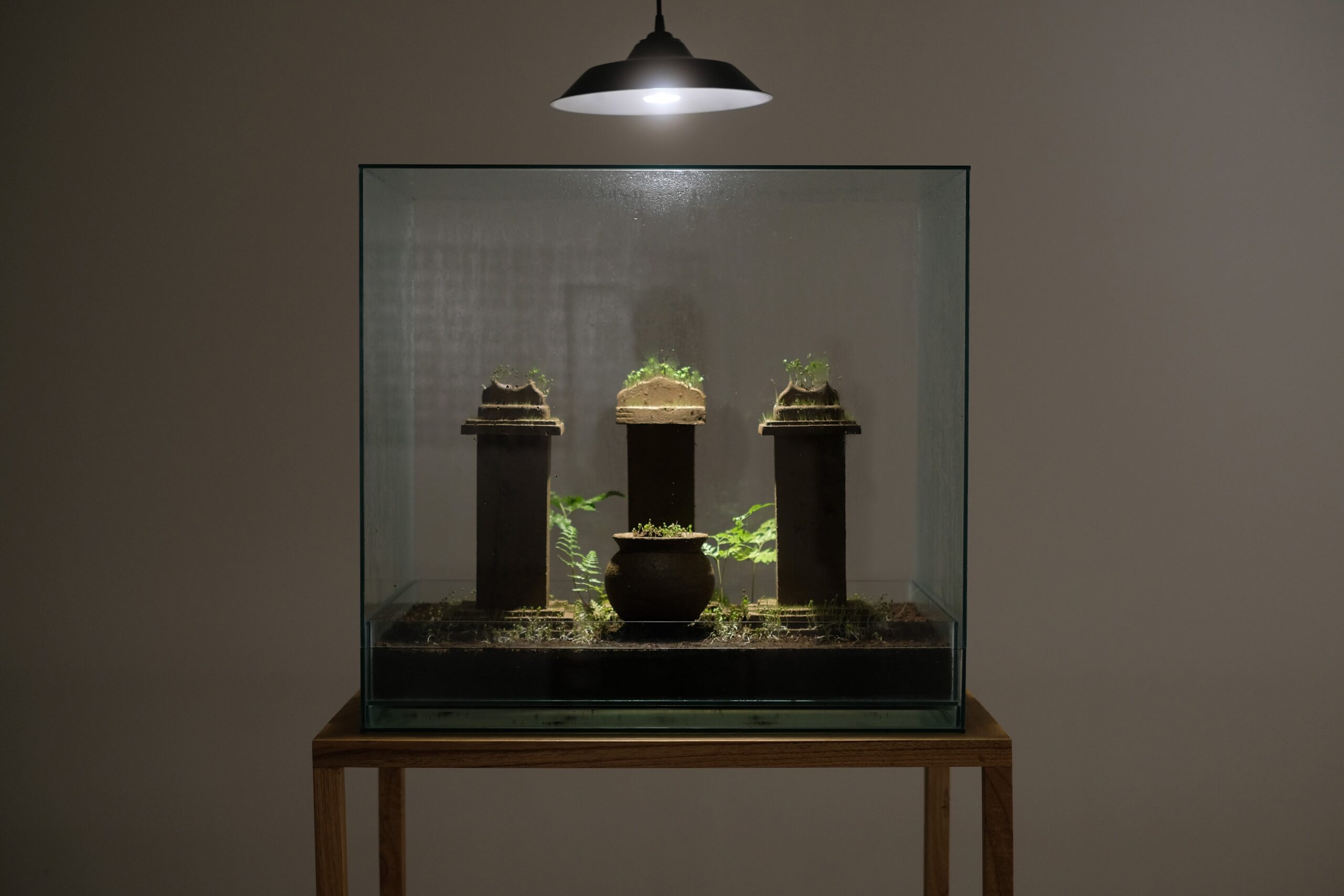There are 12 works presented in this exhibition. Nine of them are objects made of earthenware clay, organic compost, and various seeds contained in nine individual glass cases. The other three are ceramic (terracotta) installations. The majority of the objects are replicas of urns, altar sets and ancestral tablets, or name plates, commonly found in Chinese religious or spiritual practices. Serving as the central focus of the exhibition, all the clay objects can be seen as living metaphors that speak of the idea of embodied time. I am fascinated by the question of time and how time can be made concrete in a process that involves growth, and that will make the physical state of the work gradually change over the course of the exhibition. Another work in the exhibition that also speaks about the transitory nature of matter is the terracotta work called ‘Annica: Statues’. The work is a result of the process of replicating one individual object (found object) through a slip-casting technique using plaster mold. There is only one mold being used to reproduce the object indefinitely. Because of the repeated act of slip casting, the interior of the mold slowly begins to degrade and loses all the details and the identity of the object, slowly and gradually transforming the object into being unrecognisable. I am trying to look at how these ideas of impermanence, embodied time, and living metaphors can be translated into different contexts by choosing different objects to be replicated that may generate different associations in the audiences’ mind.