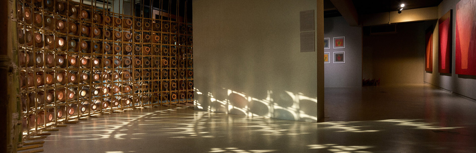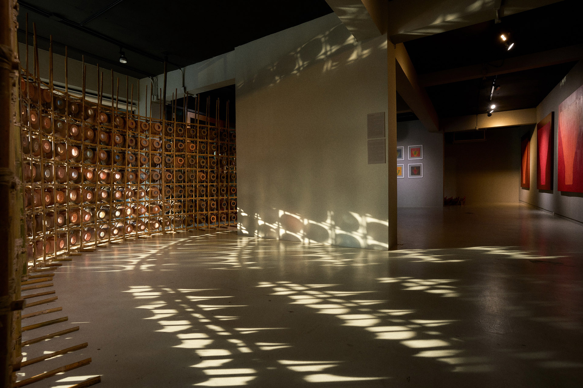 The mortar is the main focus of the exhibition; to symbolise Isan culture and give appreciation to the tool found in many Thai people’s kitchens. The mortar installations were crafted with the help of skilled potters from the ‘Tai Yor’ community in Tha Uthen District, Nakhon Phanom. Each piece has its own unique identity, I alternated the usual circular mouth into a square shape. Through each of the 300 mortars, a circular hole was mounted with 300 pictures of Isan life printed on clear acrylics, offering viewers a glimpse of Isan. They are strung in layers in a rectangular bamboo structure, which resembles the ‘illuminated boat’, which is the procession created to celebrate the end of the Buddhist lent and to pay respect to the Naga on the Mekong River in Nakhon Phanom. I reference the ‘Red Earth’ through the large-scale paintings of the mortar, the red colour palette extracted from dry Isan soil. The paintings look very similar but they are not the same. Just like somtum – the food, you can never make the same somtum ever, even though you use the same mortar or the same ingredients.