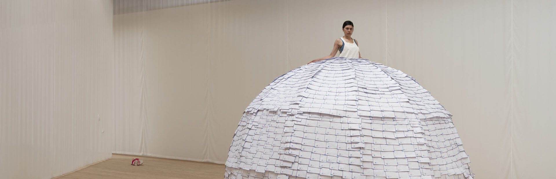 Cuenca Rasmussen’s book title was taken from her 2021 solo exhibition with the same name. A hybrid of performance, costume design and architectural installations, this project depicts ethnicity and nomadic life. Despite the broad themes surrounding this project, Cuenca Rasmussen’s unique perspective and activism is present in the details of her installations. This includes a sculpture inspired by South Asian stilt houses assembled with a traditional Danish roof technique called thatching, and her wearable installation following the shape of an igloo, a home vulnerable to disappearing due to the climate crisis.