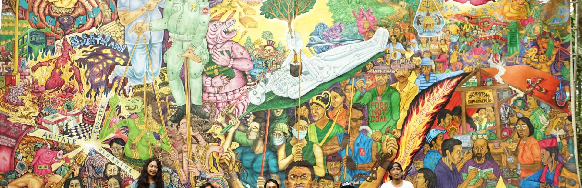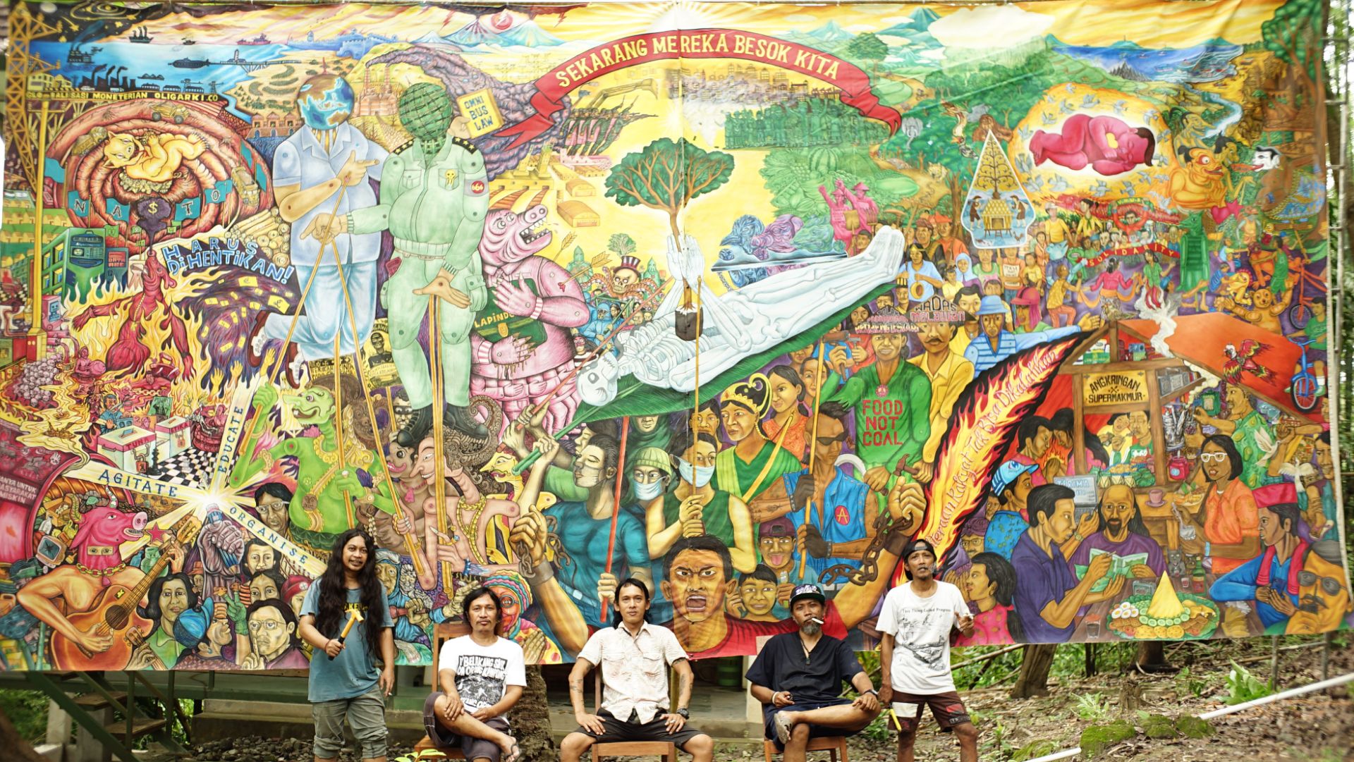 Taring Padi is an art collective based in Yogyakarta, Indonesia, formed in 1998 after the fall of President Suharto’s New Order regime. They are known for rejecting the notion of art for art’s sake, and use their work to convey socio-political messages. Their name refers to the sharp tip of the rice plant, which, upon contact with the skin, can cause it to itch. The collective believes in the use of their works to create an “itchy” effect on those in power. Taring Padi’s mission is to use art as a medium to advocate for and strategise a united front supporting democratic and popular change in Indonesia.