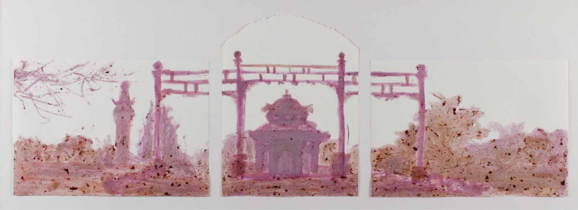 The ‘Mausoleum’ drawing series are based on my uncle’s photographs from the 1950s, taken in front of the tombs of the kings (Thieu Tri, Dong Khanh, Khai Dinh) in Hue, a citadel which housed the old capital of Vietnam. Those drawings are a sort of third space, emerging from twists and distortions between my memory and my uncle’s memory. By using decaying plant-based pigments, I think the materials reveal the mausoleum’s deterioration in reality.