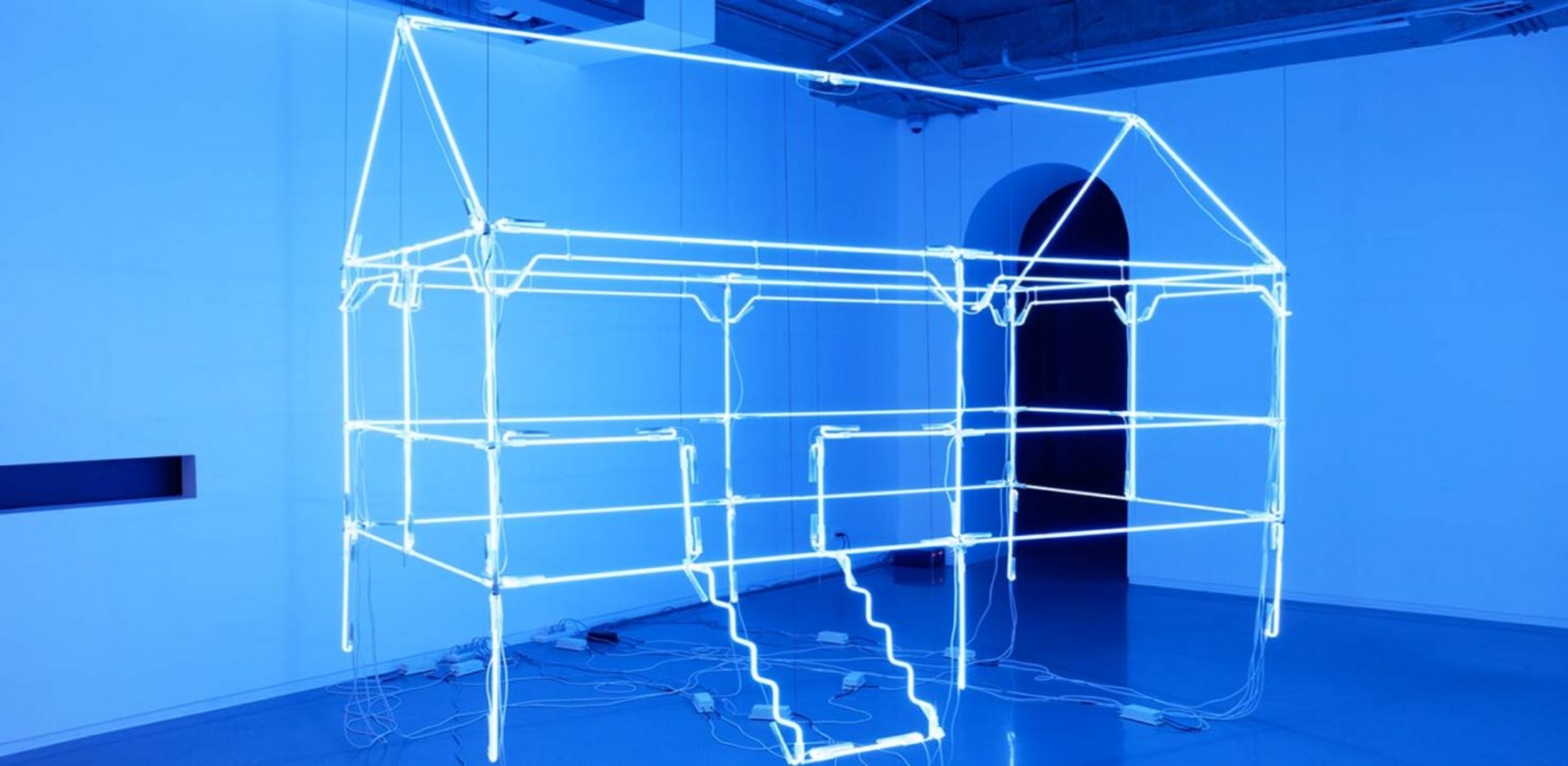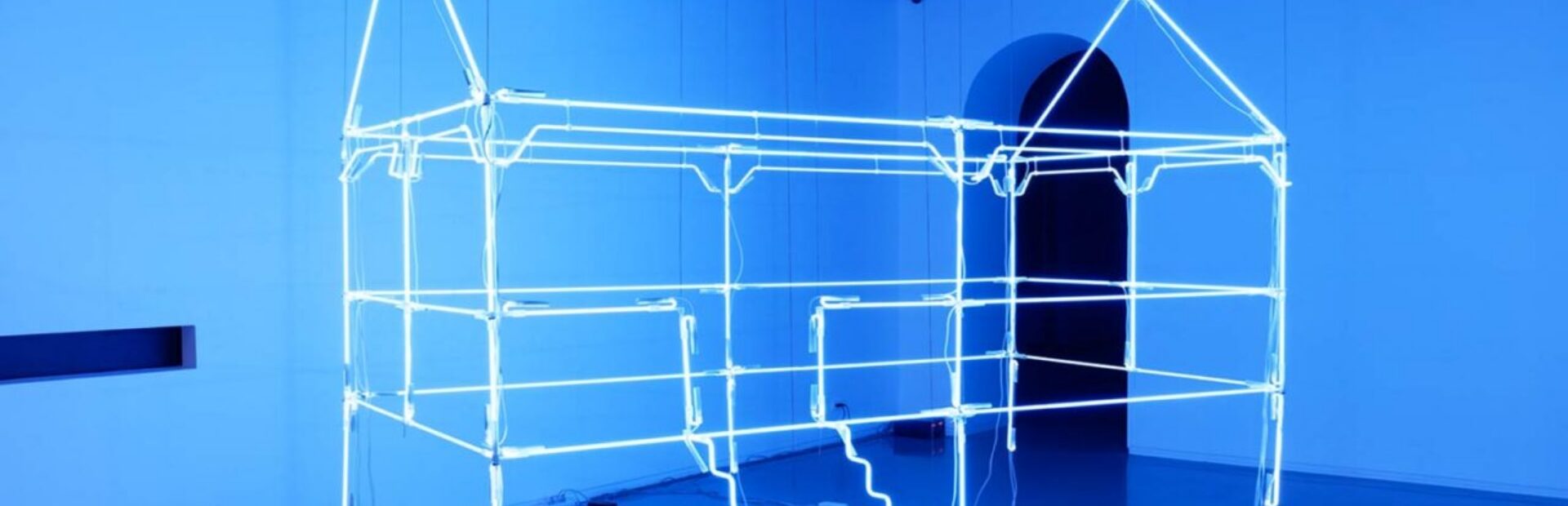 In the installation, Vuth adopts the outline of Sala Samnak creating a geometrical form that resembles a shelter or hut. The outline, however, is not made of solid matter but light in the form of blue neon tubes that, attached together, constitute the skeleton of this otherwise sturdy architectural structure. ‘Light’ in terms of luminescence and weight, the work is suspended from the ceiling, evoking an otherworldly dimension of the Sala as a vision that emerges from past traditions in which cultural belonging is rooted. In departing from and abstracting traditional forms of domestic and communal use, the notion of belonging gravitates on the conception of home as movable yet irreplaceable, a locale from which we come from and yearn to return.